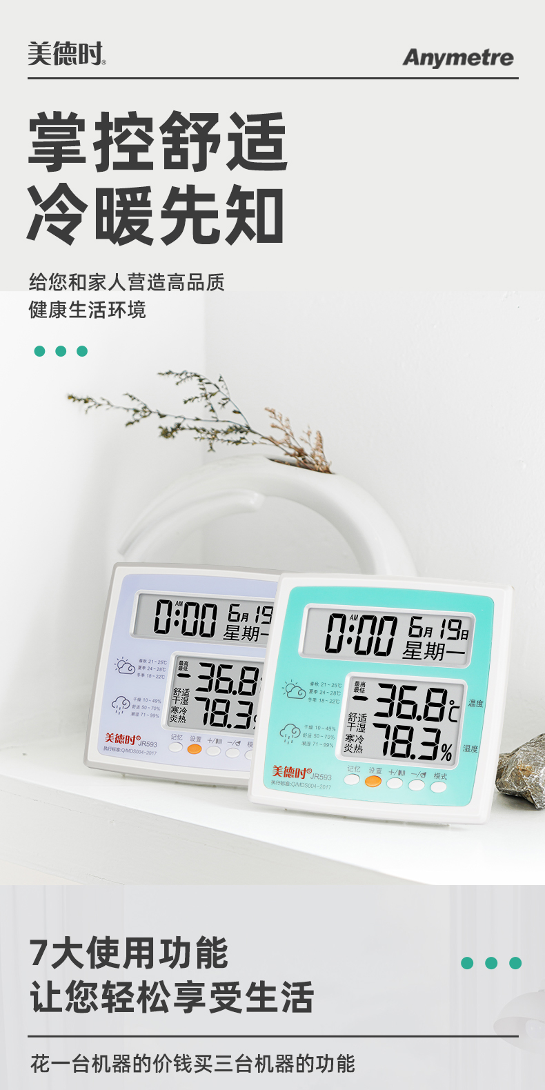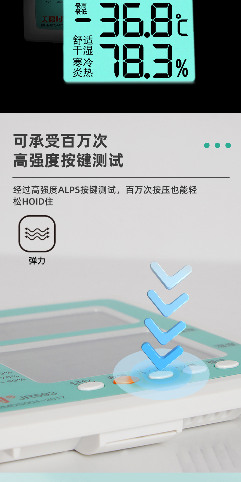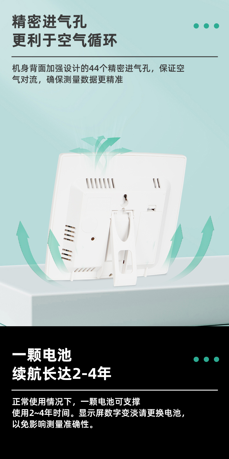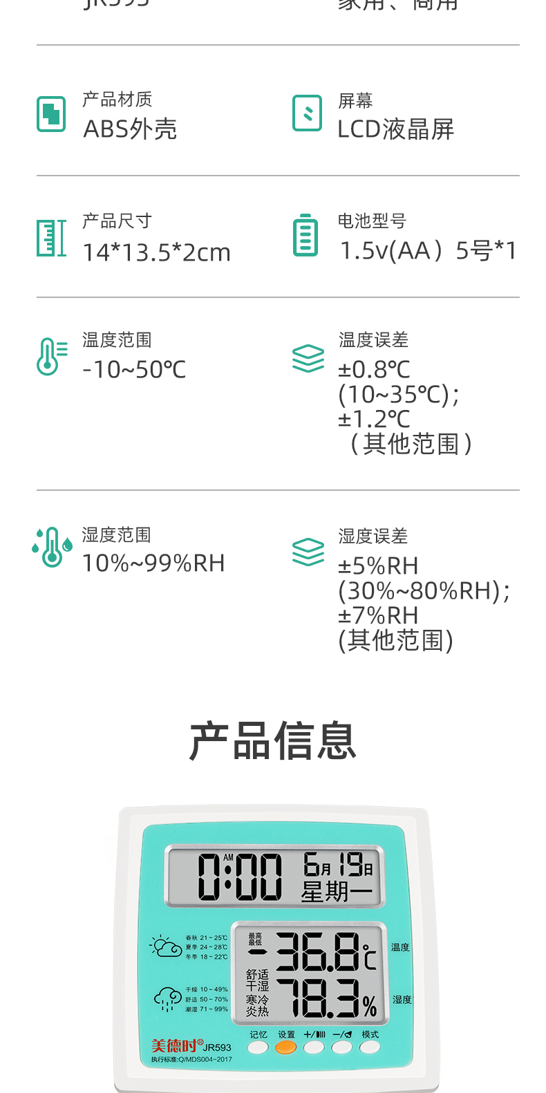 产品说明:本产品是一款用于室内的温湿度计,装有精密的物理感应部件,能准确测量附近的温湿度,提醒我们调整合适的环境温湿度,保护财产安全,保障身体健康等