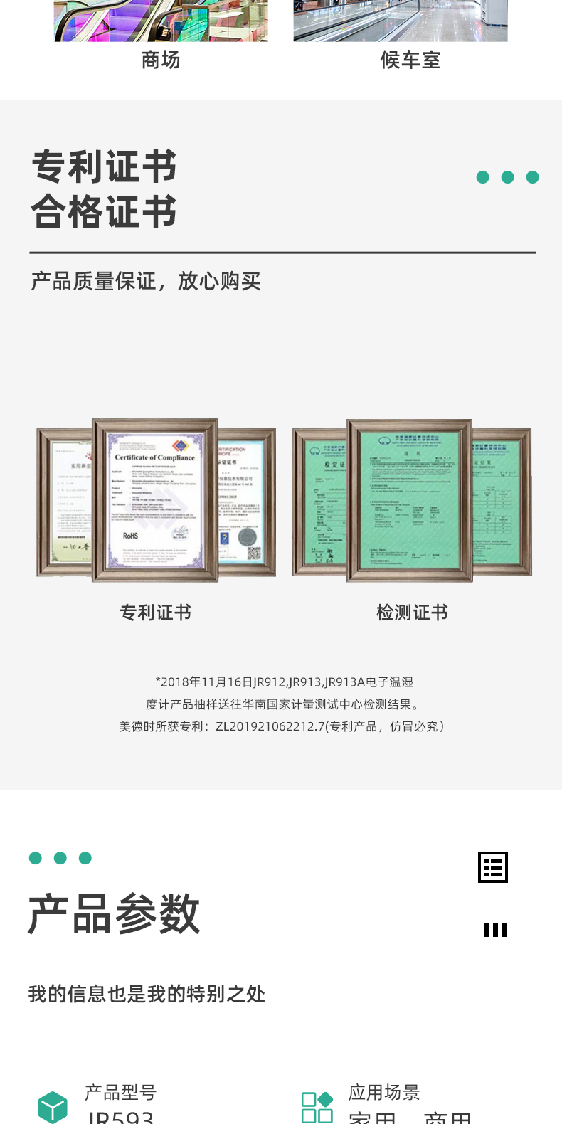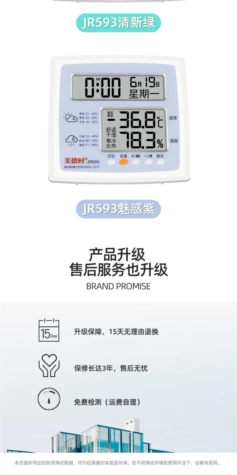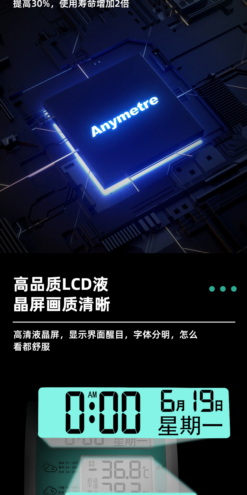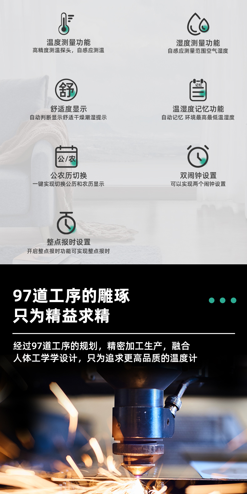产品说明:本产品是一款用于室内的温湿度计,装有精密的物理感应部件,能准确测量附近的温湿度,提醒我们调整合适的环境温湿度,保护财产安全,保障身体健康等